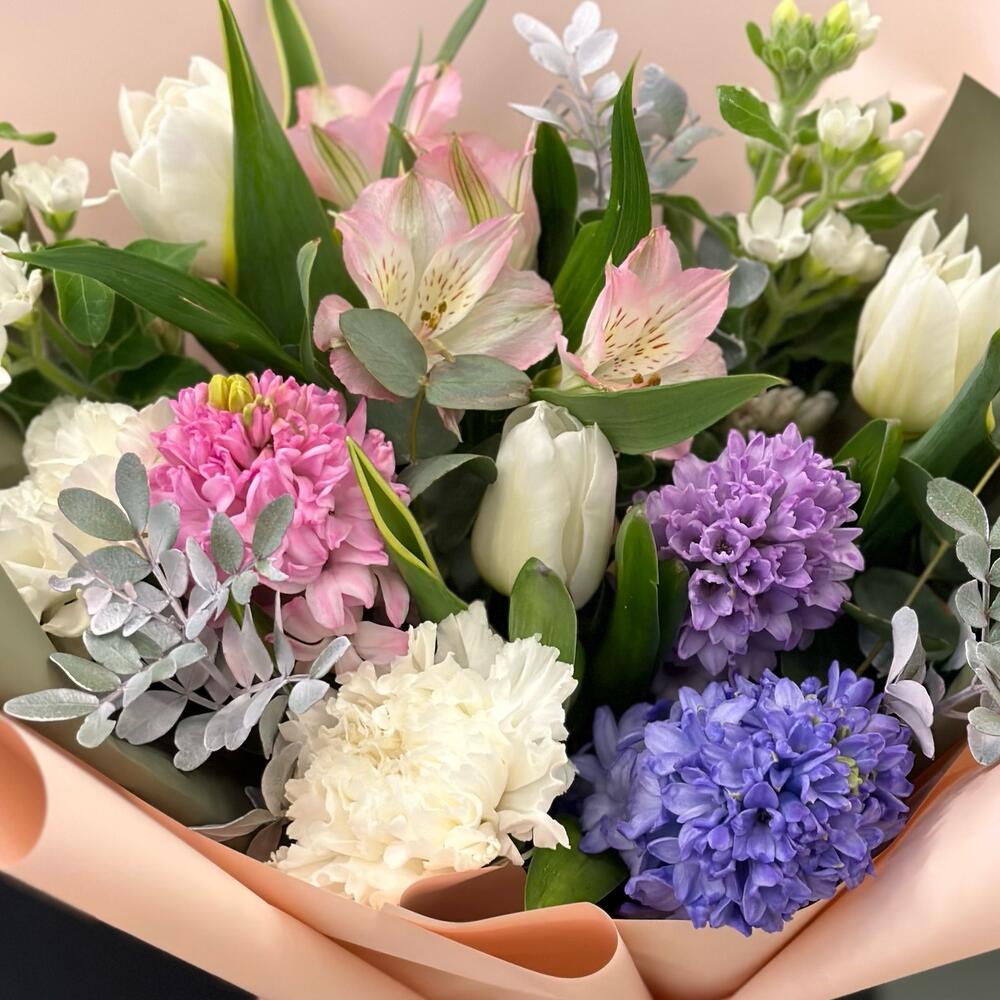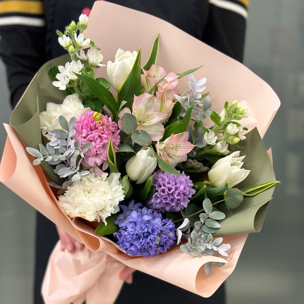Гиацинт – 3 шт.Тюльпан – 3 шт.Диантус – 2 шт.Альстромерия – 1 шт.Оксипеталум – 2 шт.Фисташка – 3 шт.Дизайнерская упаковка – 2 шт.Лента атласная – 1 шт.