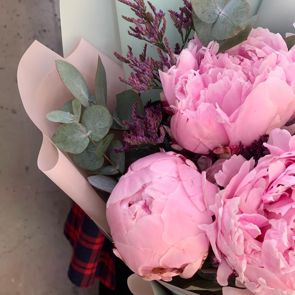 Пион Сара Бернар – 5 шт.Лимониум – 1 шт.Эвкалипт – 1 шт.Упаковка дизайнерская – 1 шт.Лента атласная – 2 шт.