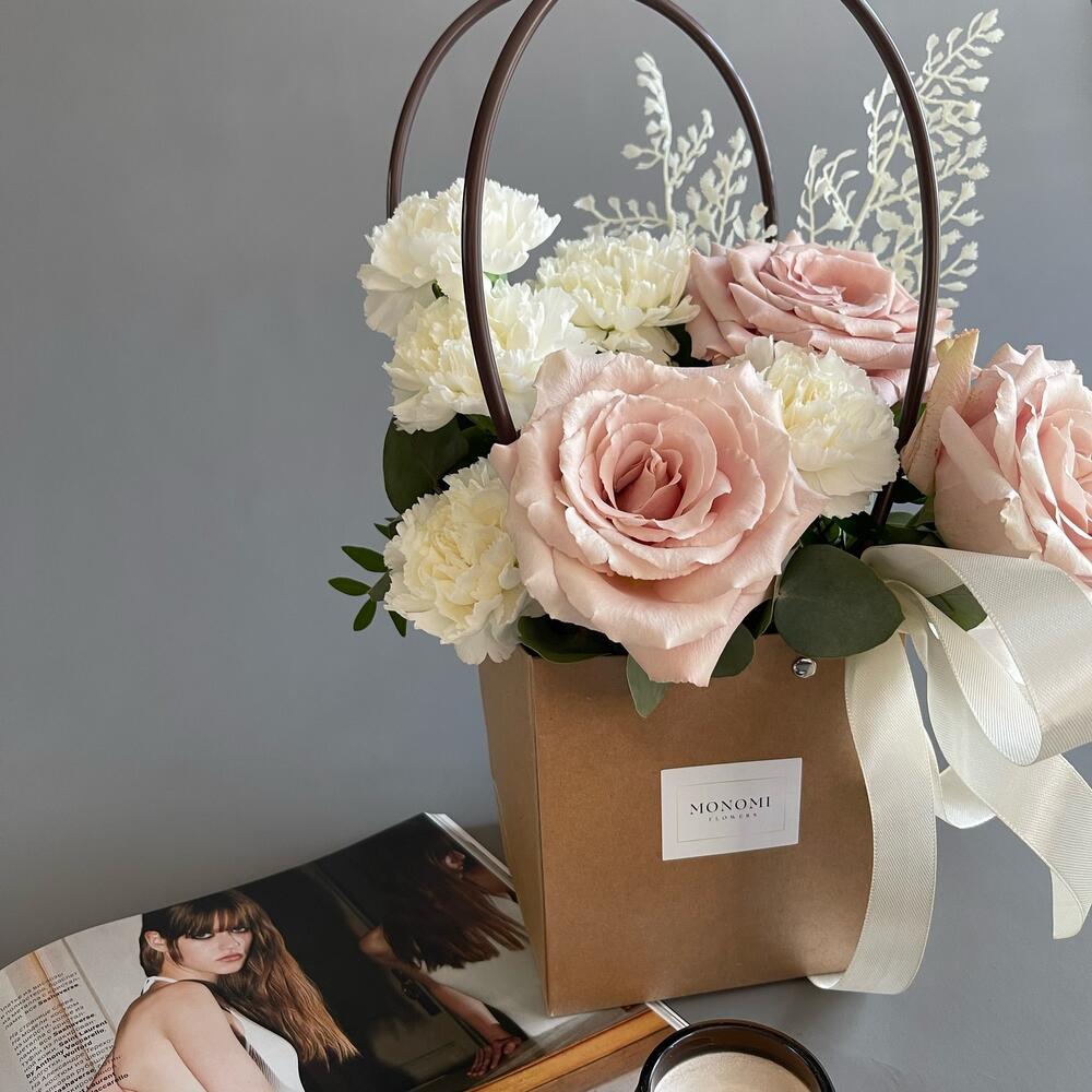 роза квиксенд – 3 шт.Диантус – 6 шт.Эвкалипт – 3 шт.ветки декоративные – 2 шт.Оазис флористический – 1 шт.Корзина – 1 шт.Лента атласная – 1 шт.наклейка фирменная – 1 шт.