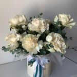 Эвкалипт – 6 шт.Коробка – 1 шт.Роза французская – 7 шт.Оазис флористический – 1 шт.