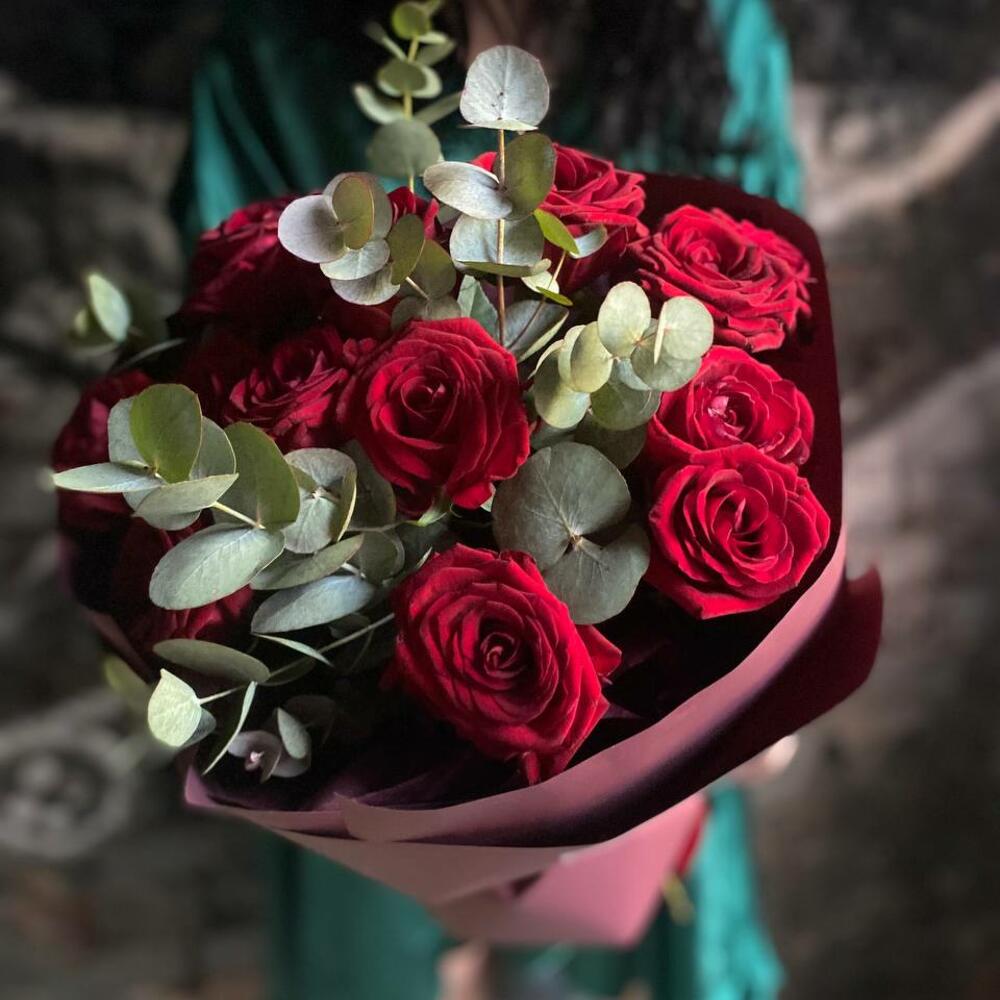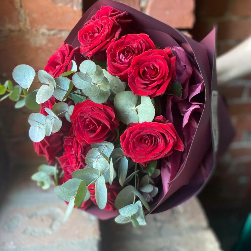 Букет из 13 красных роз и эвкалипта в стильной упаковке “Бордовый нуар”
