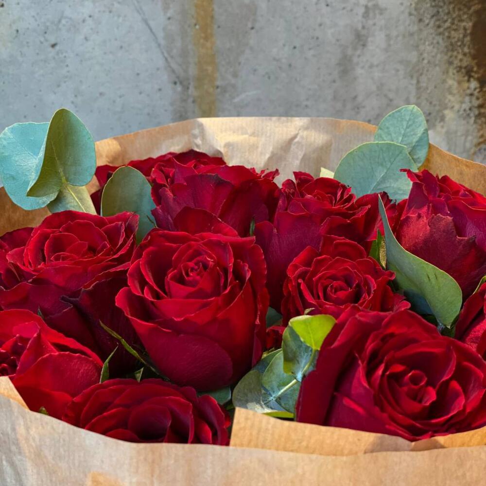 Букет из красных роз с эвкалиптом в крафте