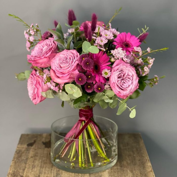 Ваксфлауэр – 3 шт.Лента – 2 шт.Рускус – 3 шт.Эвкалипт – 1 шт.Роза одноголовая – 7 шт.Гербера мини – 3 шт.Аквабокс – 1 шт.Пакет подарочный – 1 шт.Лагурус – 7 шт.хризантема сантини росси пинк – 2 шт.хризантема пурпетта – 3 шт.