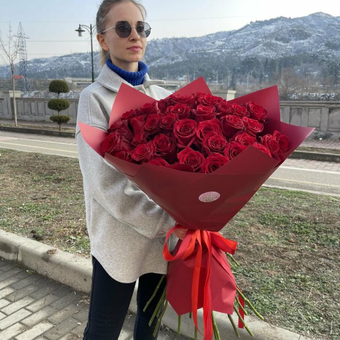 Роза красная – 35 шт. Упаковка – 1 шт. Атласная лента – 1 шт.